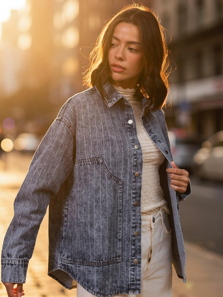 Meet your new “throw-on and look put together” top. This washed striped denim button-down gives effortless cool-girl energy — soft, relaxed, and perfect for layering as an outerwear moment. Pair with leggings, cargos, or literally anything. Instant vibe.